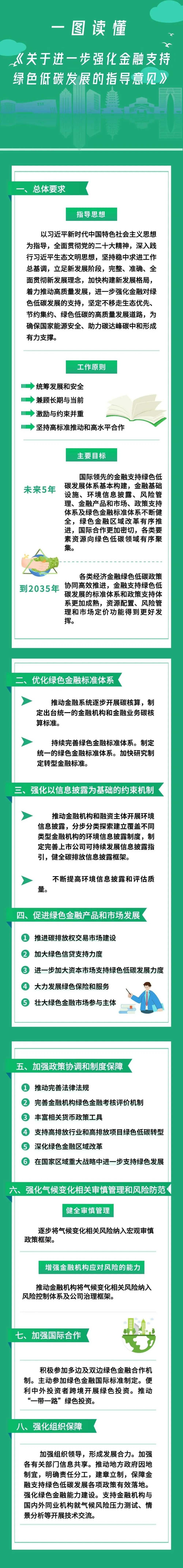 《意見(jiàn)》共八部分24條。圍繞強(qiáng)化金融支持綠色低碳發(fā)展,《意見(jiàn)》提出的主要目標(biāo)是,未來(lái)5年,國(guó)際領(lǐng)先的金融支持綠色低碳發(fā)展體系基本構(gòu)建;到2035年,各類(lèi)經(jīng)濟(jì)金融綠色低碳政策協(xié)同高效推進(jìn),金融支持綠色低碳發(fā)展的標(biāo)準(zhǔn)體系和政策支持體系更加成熟,資源配置、風(fēng)險(xiǎn)管理和市場(chǎng)定價(jià)功能得到更好發(fā)揮。